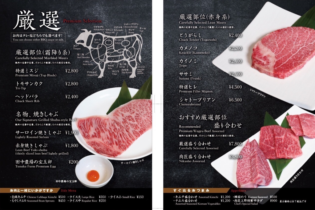 Welcome to Nikusho Ueno! The master chef Kakinuma with a 40-year career in the Yakiniku (Japanese BBQ) industry carefully selects the special black cattle, using only high-quality ingredients, exclusive cuts, and sources chosen for the premium Wagyu Beef. Please enjoy and savor the delicious beef at the Yakiniku Restaurant Nikusho Ueno in Nakano, Tokyo.